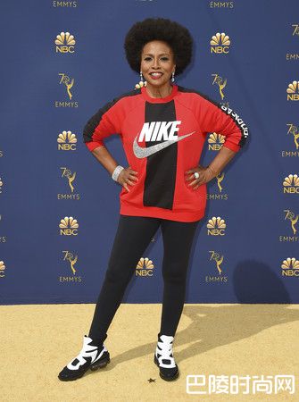 很少看到女明星走红毯没穿礼服,顶多就是帅气西装打扮,《喜新不厌旧》女星珍妮弗路易斯(Jenifer Lewis)却直接穿上NIKE运动服、运动裤及运动鞋走上红毯。其实是NIKE先前广告找上美式足球(NFL)唱国歌单膝跪地抗议种族歧视的球星、前旧金山49人队四分卫卡普尼克(Colin Kaepernick),导致部份消费者抵制,甚至烧掉NIKE球鞋抗议,而她的这身打扮是想要支持NIKE。