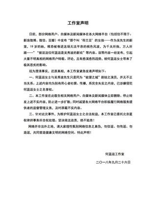 何蓝逗工作室也发表声明,强调和吴秀波先生同为《欲望之城》的演员,并无不正当关系,并要求造谣网友、自媒体等立即删除不实内容。她的经纪人见到热搜话题感到很心痛,我不知道这样一个单纯的小朋友那些造谣的人是怎么做到去伤害她的。还有一些吃瓜跟风的,也许你们不是坏人,还自认为善良,但你们也在做恶却全然不知……。