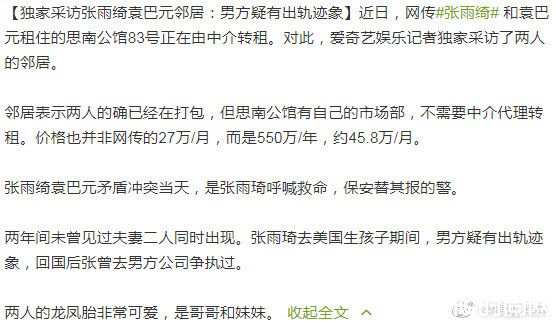 据陆媒《搜狐娱乐》报导,邻居声称已经2年没看过张雨绮和袁巴元同时出现,不仅如此,她飞往美国待产龙凤胎时,意外听闻男方可能有偷吃,回国后还去对方的公司理论,闹得很不开心。