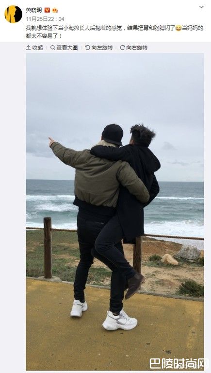 黄晓明晒出看海照,模仿老婆Angelababy一手指着海,另一只手则是抱住大人,力求还原老婆的POSE。不过他配文写道:我就想体验下当小海绵长大后抱着的感觉,结果把背和胳膊闪了!当妈妈的都太不容易了!