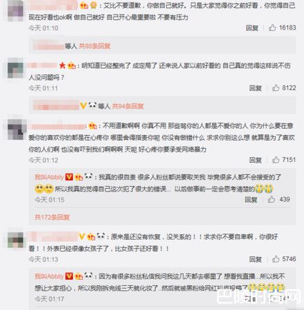 一番话让不少人看了心疼,纷纷留言为他打气:艾比不要道歉,你做自己就好、不用道歉啊啊,你真不用,那些骂你的人都是不爱你的人,你为什么要在意、尊重你的选择,你还是个小朋友,感觉网路世界给你太大负担了。没关系啦,过了恢复期应该会好很多的。就是不要太在意别人的眼光了,因为你还小,一定要坚持做自己下去啊!不要像人们说的什么网红这条路毁了你。