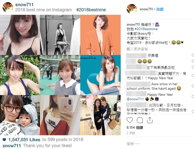 孙慧雪按赞数最高的前9名中,与身材有关的就有6张,当中不乏是大深V、露沟,或是西装外套里什么都没穿的性感照,等于衣服越少赞数越高,她无奈大喊,希望2019年大家的喜好能改变,多衫多like啦!