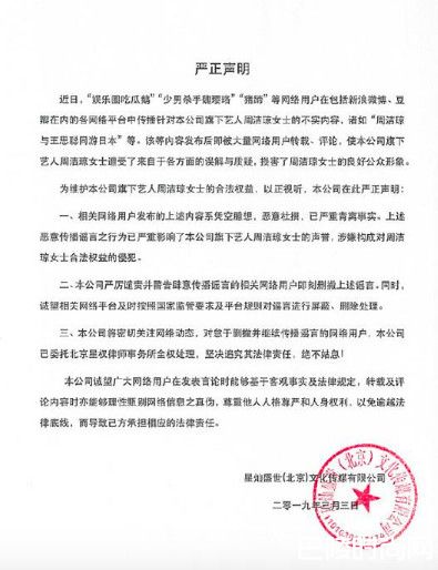 周洁琼日前遭传在机场被拍到与王思聪同游日本,谣言越传越歪,她所属的经纪公司星灿盛世3日出面止谣,微博传出的是凭空想像的内容,要求网友立刻删除相关评论,若再有不实传言传出,将追究法律责任,强硬对付网路谣言。