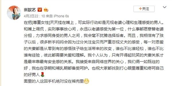 面对外界质疑感情生变,张歆艺2日发文力挺老公,认为天天挂嘴上,但是无视老婆心理、生理感受的男人,会选择事事放心上,永远以老婆为第一位的男人。她晒出潜水照,自嘲这次没把手机放在口袋里,并认为开得起玩笑的夫妻关系,才是最牢靠最有安全感的关系,我接受来自网络世界的关心,我们俩一如既往的好,我也在孕期和哺乳期都备受呵护。也祝大家都找到打心眼里尊重和疼自己的好男人!