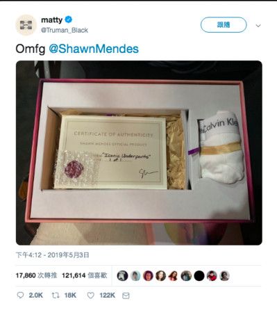 肖恩·蒙德兹果然有求必应,在Matty的那份礼盒还特地多放了一条内裤,并写上纸条传奇内裤。事后还发推特笑说:100%纯正!由于也可以翻作100%原味的意思,让不少粉丝笑说:天啊!我也想要肖恩·蒙德兹的原味内裤!