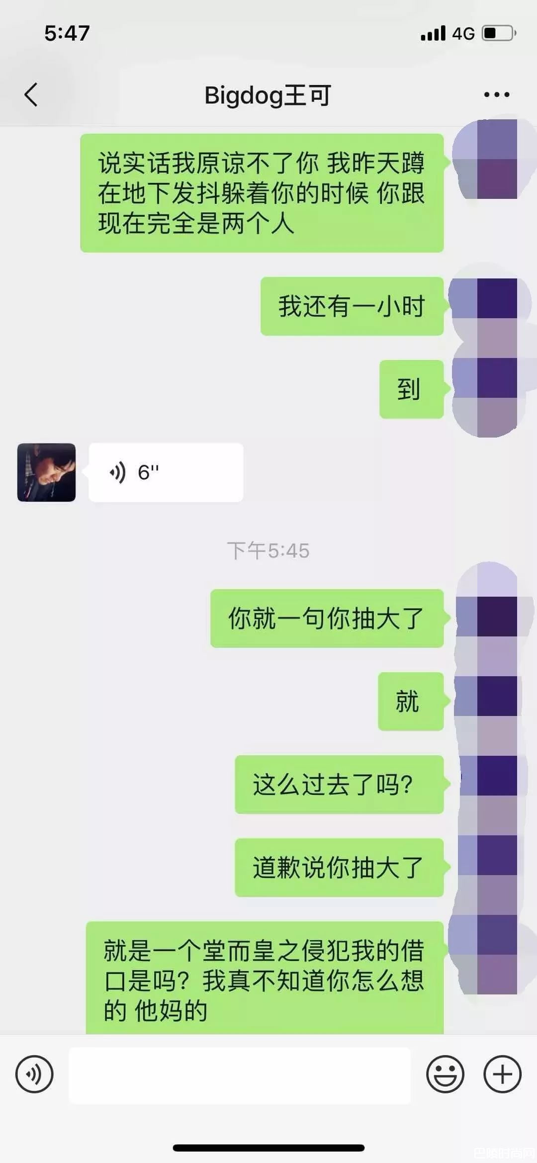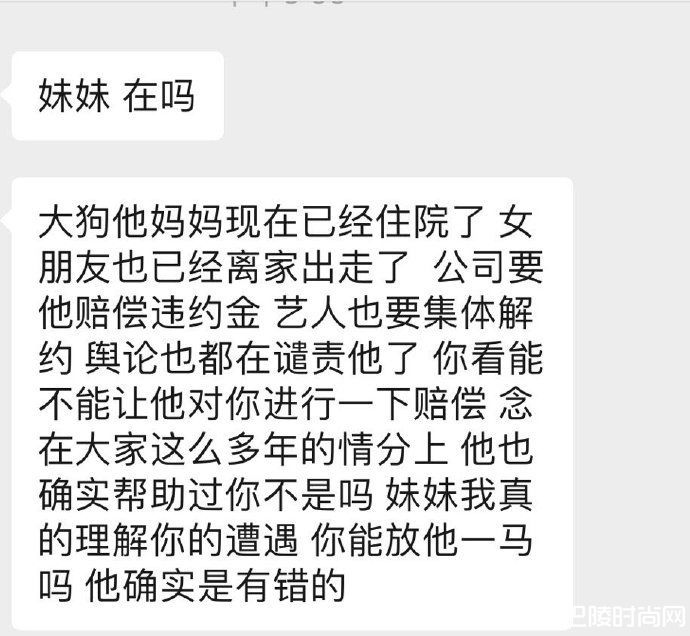 当然,大狗也没闲着,通过舆论的压力,逼迫女孩束手就擒,先是说“我们两个的事就是我们俩的事”。先让负面降到最低,想办法私了。在协商不畅时,大狗开始使出杀手锏,“不管怎么说,我错了是我错了。但我希望别让你的名字公布出来”。开始披着知心大哥哥的皮上来了,但还是协商失败。