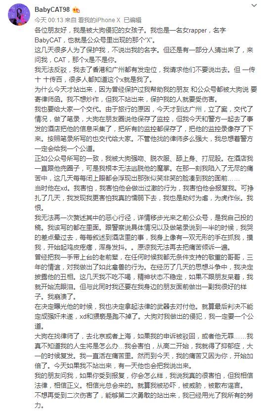 而我也想说几句,中文说唱发展到现在不容易,能走到现在仍然羸弱,多少外部因素盯着我们这个文化,而大狗这种抹黑整个圈子的事件,更是又让好事者们开始密布谣言。