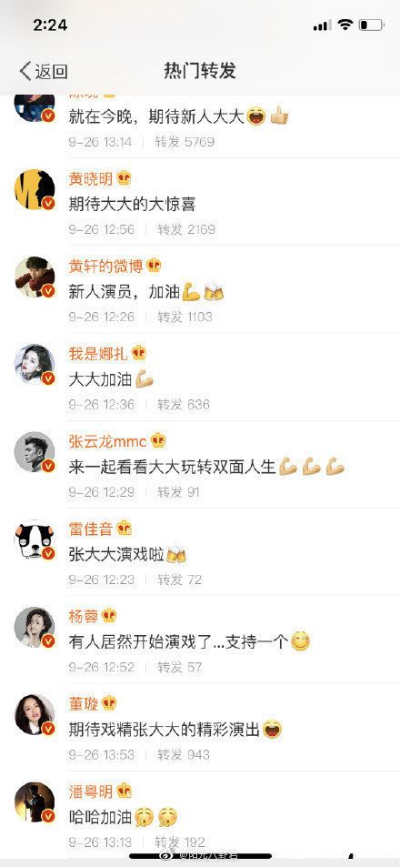 在贴文底下可以看到众星云集,包括黄晓明、Angelababy、杨洋、高伟光、景甜、杨幂、火箭少女101杨超越、董璇、黄轩等人,都留言替张大大加油,这则贴文甚至被胡歌转发,祝收视长红,超华丽的加油团让网友们都看傻了眼,吸引不少网友疯狂截图。
