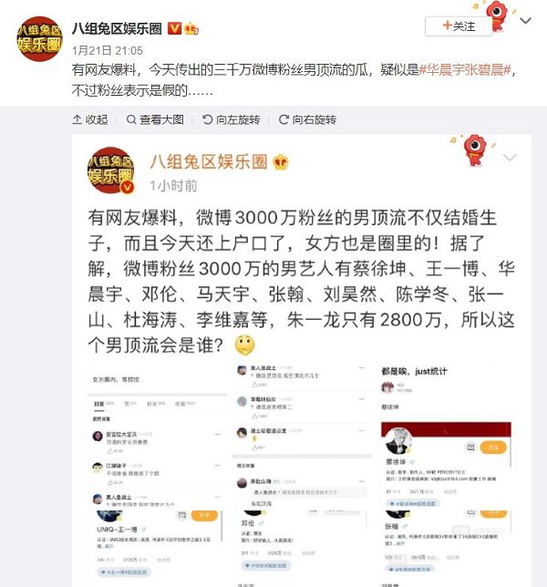近来有网友在微博上爆料,指出有蔚为柏粉丝已经高达300万以上的顶流男艺人和圈内女友隐婚生子,如今已经一岁的孩子在近日登上户口,引发大批网友热烈讨论,有不少网友根据粉丝高达3000万以上等线索,列出一串名单,包括蔡徐坤、王一博、华晨宇、邓伦、张翰、刘昊然、陈学冬等人都被列出讨论。