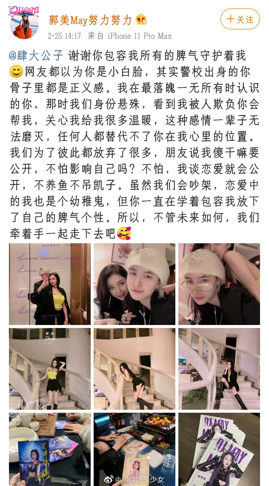 郭美美贴出的照片当中,她和另一名外型清秀帅气、留着金色极短发的女子亲密贴脸合照,看得出两人的感情相当甜蜜,这位名叫肆大公子的女子在郭美美公开恋情后,也贴文回应告白,谢谢你回到我身边谢谢你爱我,以后还有很多时间把已前经历过的一切补全,我们也还有很多很多以后。虽然没有明说,但不少网友疯猜肆大公子很可能就是郭美美入狱期间认识的狱警,两人在狱中相识生情。