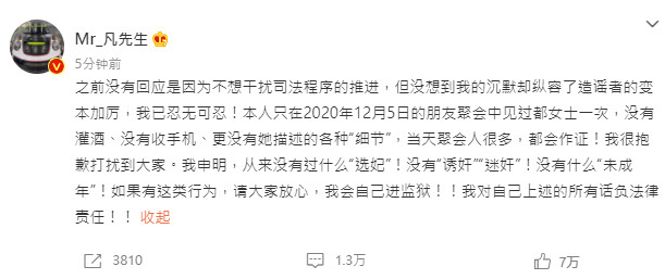 文中,吴亦凡也严正申明,从来就没有过选妃、诱奸、迷奸或未成年,他也撂下狠话:如果有这类行为,请大家放心,我会自己进监狱!!我对自己上述的所有话负法律责任!!