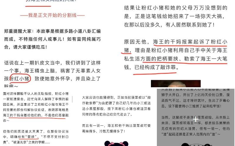 昨日(3日),有一篇微信公众号曝光了一个名为粉红小猪素人女生的经历,以海王代替男当事人姓名。文中写道,海王令粉红小猪意外怀孕,染上性病,在后续双方协商过程中,粉红小猪因斗不过对方,只好忍气吞声,去医院做手术,然后同海王干妈签订和解协议,收了一笔钱。没有想到的是,海王干妈之后以要挟、勒索起诉粉红小猪,且协议中明确写有要挟、不得不支付封口费、被逼无奈之类的字眼,导致粉红小猪被拉。