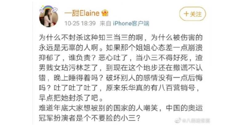结果没想到李杨璐才刚爆料,过去也曾卷入吴亦凡事件中的受害人一甜Elaine,也针对此事发声了。一甜Elaine直言:为什么不封杀这种知三当三的啊?、到现在这个地步还在撒谎不认错,晚上睡得着吗?破坏别人感情没一点后悔吗?、难道年底大家想被嘲笑,中国奥运冠军是个不要脸的小三?更直接杠上孟美岐的粉丝:问问你家孟美岐认不认识钟某人