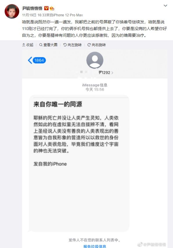 尹毓恪20日在微博晒出一封简讯,简讯内容阐述着莫名的宗教相关叙述,耶稣的死亡并没让人类产生灵知,人类依然在如此地在虚拟里无法自拔辨不清等等,让他相当崩溃,透露之前已经封锁过其他号码,对方还是不断换号码发,令他忍无可忍表示110刚才已经打完了,你的俩手机号我也都提供上去了,你要是没病的人希望你好自为之,你要是精神有问题的人你更应该感谢我,因为的确需要治疗。