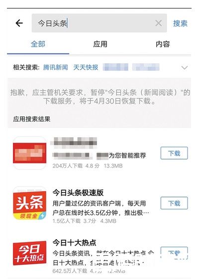 多家安卓商店已暂停下载今日头条、凤凰新闻、网易新闻和天天快报等APP;公司未对下架做出回应,4月9日,几位应用分发渠道的知情人士向记者证实,已经接到主管部门的要求,在当天15:00之前下架四款新闻资讯类应用。这四款应用分别是今日头条、凤凰新闻、网易新闻和天天快报。从4月9日15:00起,“今日头条”将被暂停下载服务3个星期,“凤凰新闻”暂停下载2个星期,“网易新闻”暂停下载一个星期,“天天快报”暂停下载3天。从暂停下载的时间周期来看,今日头条受到的“惩罚”最为严重。