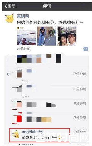 某天,有粉丝曝光疑似黄晓明朋友圈。截图中,黄晓明除了上传baby美照和恩爱照外,还写道:“何德何能可以拥有你,感恩媳妇儿!”baby恩爱回应:“恭喜你啊,老来得子!”