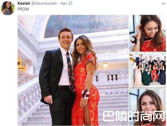 美国犹他州Woods Cross高中18岁女生的Keziah Daum上月身穿一条红色的中式旗袍出席高中毕业舞会,兴高采烈地和朋友们拍照留影,并将照片贴到了推特上。她没想到的是,照片给她引来了巨大的争议。