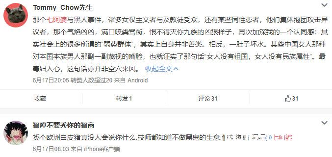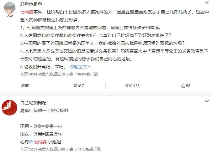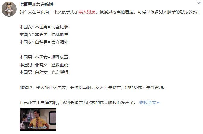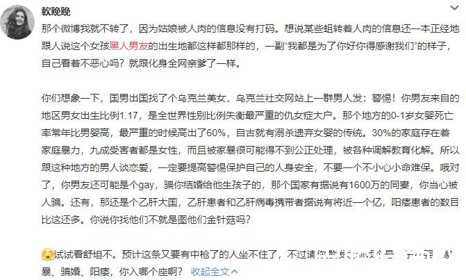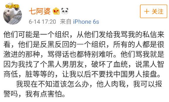 Once you go black,never you go back.长沙一名女大生半年前与非裔男子坠入情网,不时在网上打卡放闪,频频称赞男友温柔体贴。有一次,她与女性友人在文章讨论到性事,结果内容引发部分男网友不满,将之截图转贴到种族主义社团,害得女大生惨遭上百人围剿卖国婊,还连日收到死亡威胁,扬言要性侵杀害,吓得她一度关闭微博,引发网友热议。
