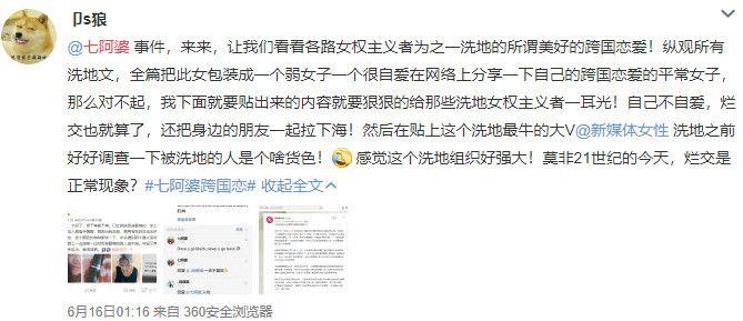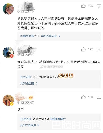 近日,王烨在微博发表数篇性事贴文,和闺蜜在贴文炫耀男友性能力,还说了句试过黑人一次,你就永远回不去,不料遭好事者截图转发反黑反回社团,害得她微博立刻被滥交、污染华夏基因、爱滋传播者、媚黑婊子等不堪入目的批评灌爆。