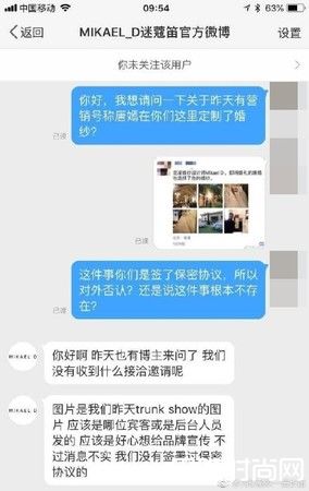 对此,有网友亲自求证婚纱公司:唐嫣在你们这里订制了婚纱?对方大方回应没有收到任何接洽邀请,至于是否因保密协议才否认,对方则澄清网路流传的婚纱是前一天走秀的照片,应该是哪位宾客或后台人员发的,应该是好心想给品牌宣传,不过消息不实,我们没有签署过保密协议。然而唐嫣和罗晋两方仍尚未出面回应。