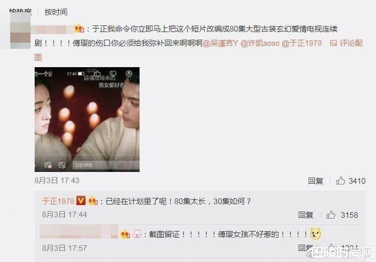 随着《延禧攻略》将要拍摄续集,有网友便将这部微电影PO给制作人于正看,跪求他可以让傅璎CP再续前缘,把微电影改编成80集的古装玄幻爱情剧,没想到于正松口坦言:已经在计画里了呢!还表示80集有点太长,30集应该会是最刚好的集数。