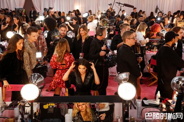 维多利亚的秘密大秀后台制服,从每年的浪漫粉红变成黑色,但性感画面依旧。