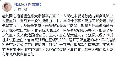白冰冰在脸书表示,10日中午吃饭时右侧鼻孔流出大量血液,和一般的流鼻血不一样,起初她以为过一下子就好了,没想到10分钟过去了,血一直没有止住,赶紧挂急诊,医师帮忙处置,紧紧捏住鼻翼两侧,同时用冰块冰敷山根位置,但血依旧不断涌出,她说:只好从喉咙吞进去,不知吞了多少的血。