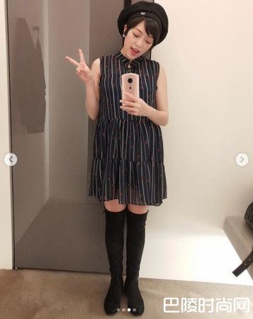 照片中,可以看到贝童彤头戴贝蕾帽,衬托俐落短发和巴掌脸,身穿条纹无袖洋装,上头印有可爱的红色图案,显见少女心,格外引起注意的是,她似乎没有孕妇所困扰的水肿问题,单从正面照来看,仅有肚皮隆起,四肢依然纤细,搭配过膝马靴,辣度爆表。