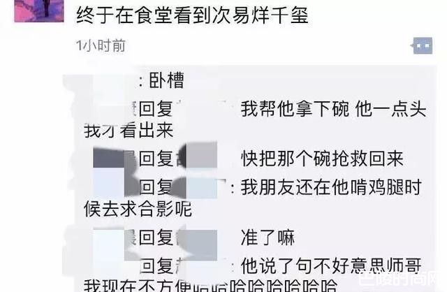 有网友分享在学餐偶遇的经过,起初没有认出是谁,网友帮忙递碗给易烊千玺,他点头致意后,网友才发现竟然是易烊千玺本尊,好笑的是,网友的一名朋友鼓起勇气上前要求合照,但时间点很尴尬,易烊千玺当下正在啃鸡腿,他客气地婉拒要求:不好意思师哥,我现在不太方便。