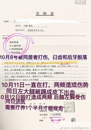 而有一名疑似是中浦悠花的好友,随即在微博PO出验伤单反击,报告中表示女方在10月8号被同居者打伤,臼齿和后牙脱落,10月11日两颊造成伤势、左大腿皮下出血,10月12日殴打造成两颊、后脑、左胸受伤,需疗养一个半月才能痊愈。