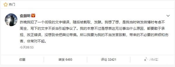 对于言论风波,俞灏明首先出面回应,解释自己所说的站,是想等待真相,我相信世界上所有的事都事出有因。不过,他经过一个晚上的沉淀,又觉得自己考虑不周,犯了低级文字错误,带来不必要的麻烦和伤害,因而重新发文道歉:我的本意不过是想表达无论事出什么原因,都要敢于承担、改正错误,没想到会把舆论带偏。