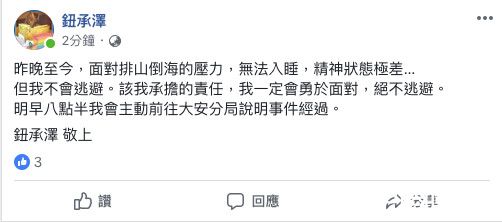 钮承泽6日晚间在脸书发文:昨晚至今,面对排山倒海的压力,无法入睡,精神状态极差…但我不会逃避。该我承担的责任,我一定会勇于面对,绝不逃避。对于这起造成社会轰动的性侵风波,他表示7日早上8点半将主动前往大安分局,向警方说明事件经过。