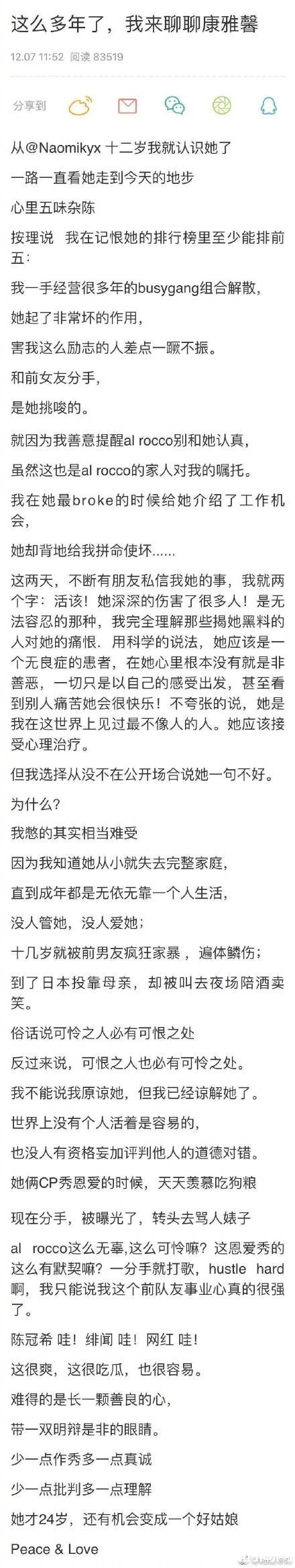 另外,曾参加过《新说唱》的男Rapper俞天时KOZAY,也在微博发文,表示已经认识Naomi12年,更透露自己的组合解散、和前女友分手,全是拜对方所赐,更爆料女方曾被前男友家暴,被母亲叫去酒店陪酒等,他感叹:可恨之人必有可怜之处。同情对方从小失去完整家庭,一直无依无靠,他更直言:她才24岁,还有机会变成一个好姑娘。盼大家少一点批判、多一点理解。