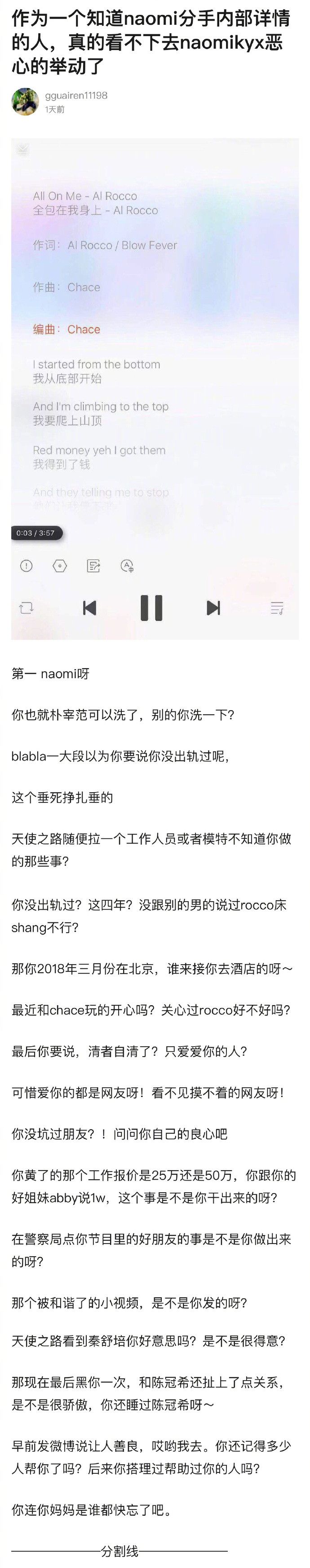 Naomi跟Alrocco分手后,有网友在豆瓣发文,痛批Naomi人前表现出超爱Alrocco的模样,但私下经常跟别的男生约炮,她身边的朋友、圈内人(除了Alrocco)都知道她出轨多少次,她在上《天使之路》的时候,就跟里面的工作人员睡,所有模特和剧组的人都知道。还放话可以去问每一个工作人员,看看所言是否为真。更爆料她和陈冠希有过特殊关系,在网路上掀起轩然大波。