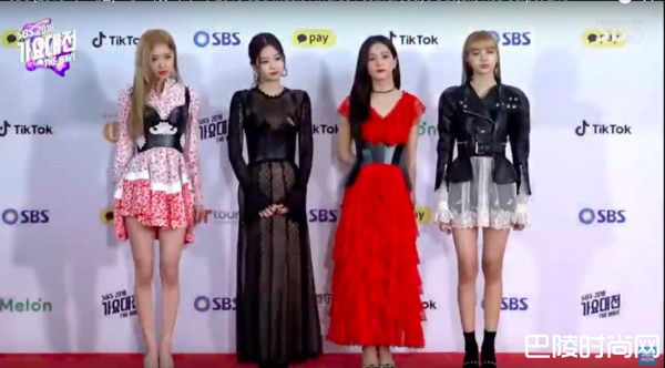 BLACKPINK四美走上红毯,Rosé穿上碎花洋装飘出青春气息,Jisoo的红洋装和Lisa的黑色皮衣都相当有气势,至于Jennie则展现出小性感,以一袭透视篓空洋装现身。不过Jennie似乎是内搭了肤色内里,视觉上却像下半身没穿,让观众吓了一跳。另一组人气女团TWICE也走成熟风,全员穿黑色喇叭裤出现,MOMO更性感露出半边肩膀。