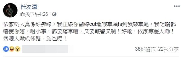 杜汶泽同时在个人脸书发文,指称是保时捷撞到自己车尾,原本告诉对方不用赔,但不被领情,这样小事,都要下车嚷,又要报警什么的!好,现在等警察!塞住人家整条道路,为什么要这样呢!