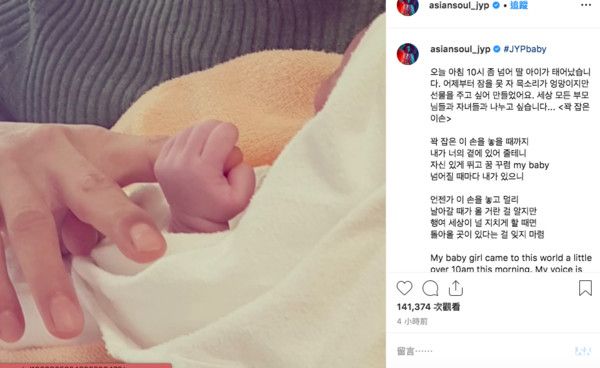 附上一张女儿紧握着朴轸永的手,照片氛围温馨,他虽没有公开女儿的长相,但照片里流露出爸爸的满满爱意,加上他的温暖嗓音,令歌迷听得如痴如醉,纷纷送上祝贺。