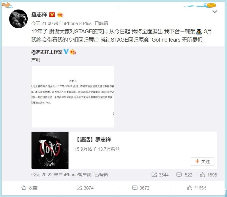 罗志祥18日亲自宣布退出STAGE,但并未说明详细原因,仅保守表示因为未来不同生涯规划。他晚间在微博发文感慨:12年了,谢谢大家对STAGE的支持,从今日起,我将全面退出,我下台一鞠躬。