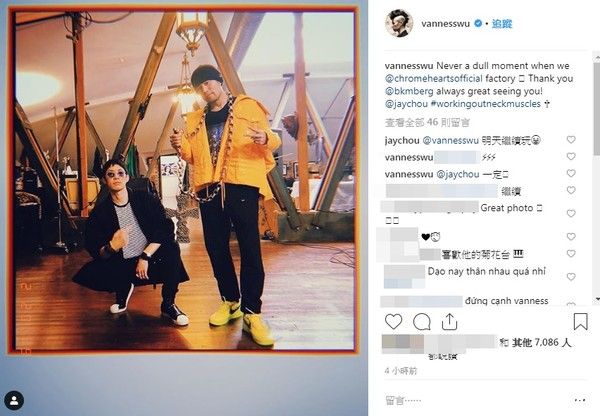 吴建豪21日中午在IG发文,PO出和周杰伦的合照写下:#workingoutneckmuscles~开玩笑要脖子上戴着超大一条项炼的周杰伦好好锻炼颈部肌肉,而周杰伦则是留言邀他:明天继续玩!似乎不受离婚一事影响,但已引起许多粉丝涌入IG留言关心。对此,环球音乐表示:婚姻是二人之间的事,请大家给予他们空间。