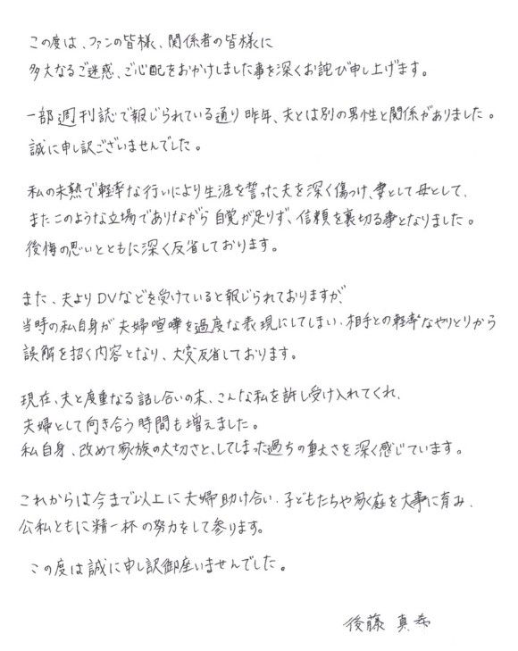 后藤真希坦承如同周刊报导,我去年(2018)和别的男人发生关系,真的很抱歉。我轻率不成熟的行为,深深伤害了誓言相守一生的丈夫,身为妻子、身为母亲,还没有做好这个角色的自觉,做出了背叛信任的事,现在除了很后悔,也深深地反省中。