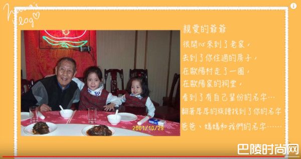 短暂停留后,欧阳娜娜在片尾写下心情:亲爱的爷爷,很开心来到了老家,去到了你住过的房子,在欧阳村走了一圈,在欧阳家的祠堂,看到了有自己辈份的名字…。她似乎非常想念爷爷,你的女儿、儿子、孙子、曾孙子…大家都很好,都很想念你…。