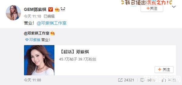 19日一个名为邓紫棋工作室的帐号发文:营业。简洁有力的2个字,正式宣布业务展开,随后邓紫棋亲自转发工作室的PO文认证,似乎意味着又近一步与蜂鸟音乐划分关系。