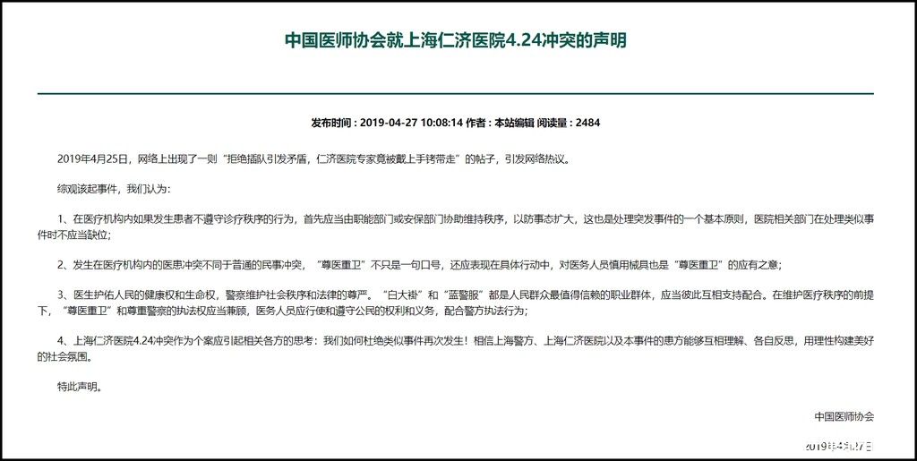 由于争议持续延烧,中国医师协会也发出声明表示,医护人员负责病人的健康权和生命权,而警察则是维护社会秩序和法律的尊严;在医院内如果发生患者不遵守秩序的行为,应该要由保安部门协助处理,防止事情继续扩大,这也是处理突发事件的基本原则,医院相关部门在处理类似事件时不应缺席。
