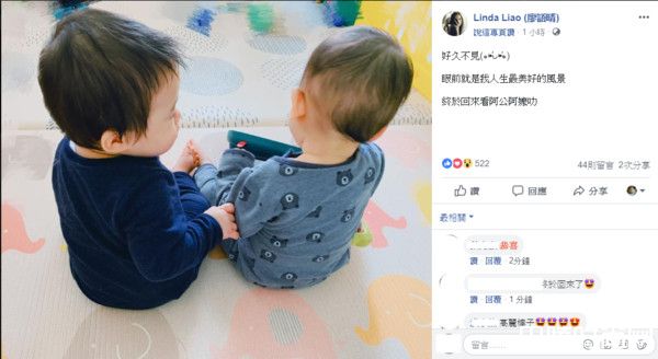37岁的Linda在脸书照片写着好久不见,眼前就是我人生最美好的风景,终于回来看阿公阿嬷叻(了)。一对双胞胎儿子虽然只见到背影,但胖嘟嘟的侧脸相当可爱。