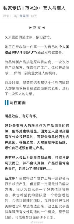 而范冰冰也直言:我认为自己是一个好的情绪管理者。所以她希望自己的团队也是如此,她透露自己只是想把对美的理念和想法表达出来,并当作是和所有女性沟通的桥梁,她更接着表示:至于其他的,可能在梦想面前都不重要。