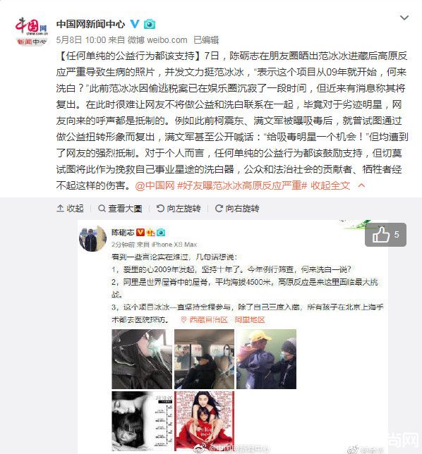 中国新闻网8日在微博回应陈励志po文:此前范冰冰因偷逃税案已在娱乐圈沉寂了一段时间,但近来有消息称其将复出,很难让网友不将做公益和洗白联系在一起。更在文末说道:任何单纯的公益行为都该鼓励支持,但切莫试图将此做为挽救自己事业星途的洗白器,公众和法治社会的贡献者、牺牲者经不起这样的伤害。狠狠打脸范冰冰。