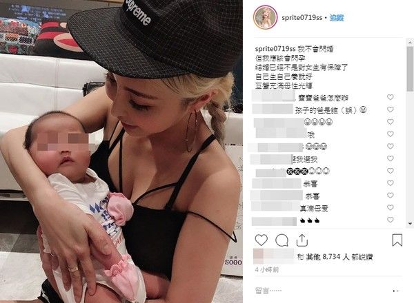 雪碧日前PO出一张小心翼翼抱着小宝宝的照片,有感而发称自己不会闪婚,但我应该会闪孕,直言现在婚姻对女生而言已经不是一种保障,她更豪气地说:自己生自己养就好,巨蟹充满母性光辉。