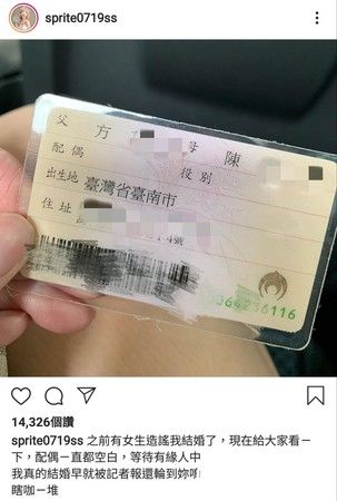 不会闪婚的话言犹在耳,近日却有爆料称雪碧已经结婚了,眼见传言沸沸扬扬,雪碧本人也在24日亲自出面辟谣,她更大方晒出身分证背面的配偶栏,给大家看一下,配偶一直都空白,等待有缘人中。或许是不满感情状态被拿来造谣,雪碧也在最后狠呛爆料者是瞎咖,更霸气地说:我真的结婚早就被记者报,还轮到你唷!
