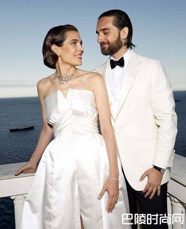第二套造型时,Charlotte Casiraghi梳着复古好莱坞式发型,穿着香奈儿订制的简约白缎礼服,并搭配传承自外婆的卡地亚三层式钻石项炼,颇有向格蕾丝凯莉1956年的造型致敬之意。