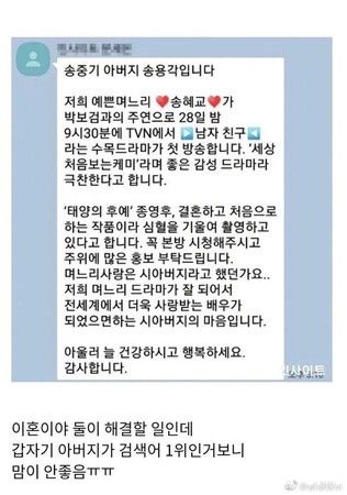 宋仲基爸爸替宋慧乔宣传电视剧的短信曝光。